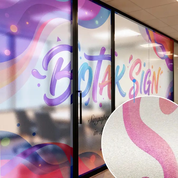 Premium Windows Frosted Sticker printing (Indoor/Outdoor) using polymeric ultra-clear film for a clean etched-glass finish with superior stability. Printed in high-resolution fine detail for sharp logos and smooth frosted gradients.